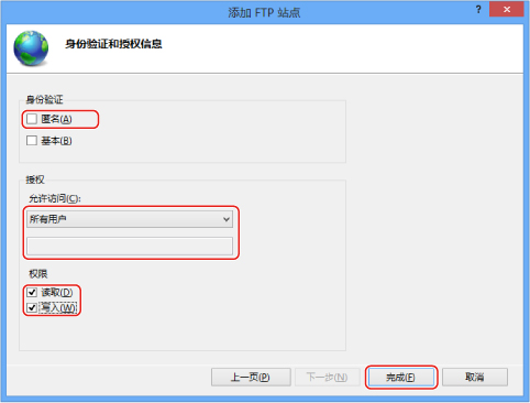 为<权限>选择[读取]和[写入]→单击[完成]。