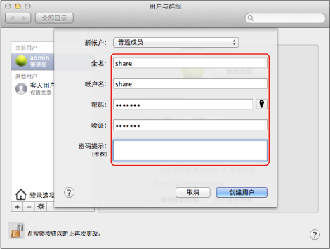 在[帐户]/[用户与群组]窗口中,输入要通过macOS从本机向其发送数据的用户名称→输入密码。