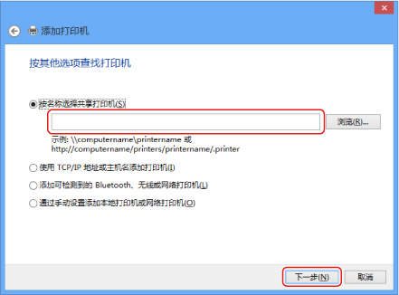 Windows Server 2008/7/Server 2008 R2/8.1:选择[添加网络、无线或Bluetooth打印机] → [我需要的打印机不在列表中] → [按名称选择共享打印机]。