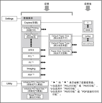 利用“打印机设置”菜单可以访问常规功能。下面是“打印机设置”菜单结构的简化框图。