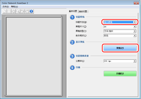 从[扫描方法]选择[稿台玻璃]→单击[预览]。