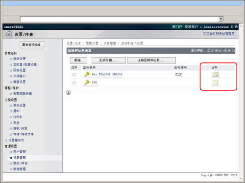生成CSR的密钥显示在“密钥和证书列表”屏幕上,但是无法直接使用它。要使用该密钥,需要注册稍后基于CSR发行的证书。 (请参阅“注册证书到密钥”) |