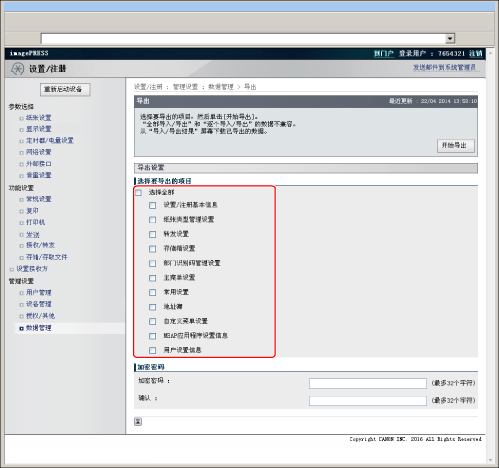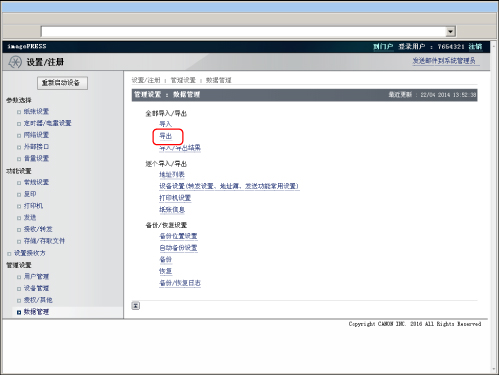 如果使用“全部导入”功能导入“部门识别码管理设置”,系统管理员信息设置(如识别码或密码)就会被覆盖。使用“全部导出”功能之前,检查导出机器的系统管理员信息,因为登录到导入的接收方机器时会用到。 在以下情况中,“全部导出”功能不可用: 执行/等待作业(发送、转发、接收互联网传真、打印报告、“定时发送”模式指定的功能) “逐个导入/导出”操作期间 使用“远程用户界面”从其他imagePRESS系列机器查看地址簿 传送设备信息 发生错误时 备份收件箱数据 |