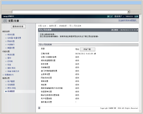 导出完成后才会显示“导入/导出结果”屏幕。 如果单击[开始下载],可以下载导出文件。 也可通过按<管理设置>的[数据管理]→[导入/导出结果]检查最新的导入/导出结果。 |