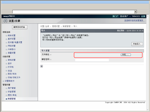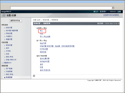 如果使用“全部导入”功能导入“部门识别码管理设置”,系统管理员信息设置(如识别码或密码)会被覆盖。使用“全部导出”功能之前,检查导出机器的系统管理员信息,因为登录到导入的接收方机器时会用到。 “全部导入”功能在以下情况中不适用: 执行/等待作业(发送、转发、接收互联网传真、打印报告、“定时发送”模式指定的功能) “逐个导入/导出”操作期间 使用“远程用户界面”从其他imagePRESS系列机器查看地址簿 传送设备信息 发生错误时 备份收件箱数据 |