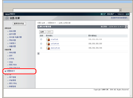 也可以通过按 (设置/注册)→[设置接收方]→[注册LDAP服务器]从本机的操作面板指定LDAP服务器设置。有关使用操作面板指定LDAP设置的说明,请参阅“LDAP服务器设置”。要指定LDAP服务器设置,必须以管理员身份登录。 |
