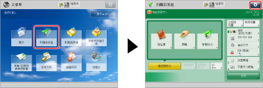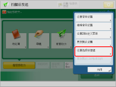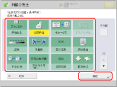 “扫描后发送”屏幕上显示两个选项快捷键。[双面原稿]和[不同尺寸原稿]显示为默认设置。这些快捷键可以更改为常用的功能。