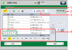 1 | 指定接收方类型按钮 按[全部]、 (电子邮件)、 (传真)、 (互联网传真)、 (文件)或 (群组)显示在每个类型中注册的接收方。 |