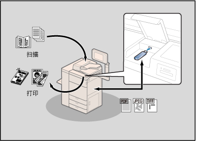 存储介质是一个存储位置,通过将USB存储器连接到USB端口(位于本机的前面)来使用。可以使用本机扫描文档并以可在计算机上使用的各种文件格式将其存储在存储介质中。也可以随时使用所需打印设置在本机上打印存储在存储介质中的文件。