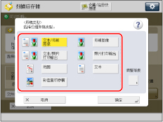 文本/印刷图像模式 | 文本/照片打印输出模式 | 地图模式 | 彩色复印原稿模式 | 印刷图像模式 | 照片打印输出模式 | 文本模式 |