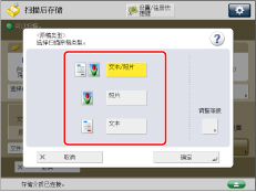 如果选择存储介质作为存储位置,选择[文本/照片]→按[调整等级]→选择[文本优先]或[照片优先]→按[确定]调整文本/照片处理优先级。 |
