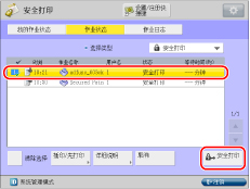其他用户发送的安全打印作业将显示为星号(“********”),并且无法对其执行操作。 如果以SSO-H管理员身份登录,则会显示所有用户发送的作业,并且可以查看作业的详细信息或取消作业。但是,只有发送安全文档的用户才能打印文档。 打印安全文档时,输入使用打印机驱动程序最初为文档指定的PIN/密码。如果存在当前或保留的作业,则安全文档将进入队列等候打印。 如果多个或所有安全文档具有相同的PIN/密码,则可以同时选择它们并清除其PIN/密码。 有关输入字符设置密码的说明,请参阅“基本操作”。 如果存在当前正在打印或等候打印的作业,则安全文档将在这些作业完成后打印。 |