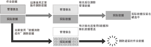 “每项功能所需的可选产品”。复印、发送、接收和打印时,本机将作业数据分类存储为管理信息和实际数据。完成作业后,自动删除管理信息,但实际数据保存在硬盘中。