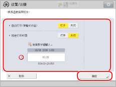 如果“设置/注册”的[管理设置]中的[显示作业日志]设置为“关闭”,则不会显示[传真通信管理报告]。 如果“设置/注册”的[管理设置]中的[显示作业日志]从“关闭”更改为“打开”,以下设置会自动切换到“关闭”: 自动打印(传输40次后) 指定打印时间 显示信息<检查打印机。(请联系客户支持中心)>指示“打印”功能不可用时,该问题解决后本机会自动打印“传真通信管理报告”。报告上打印最近的40个通信结果。 有关“传真通信管理报告”的详细信息,请参阅“传真发送/接收通信管理报告”。 |