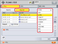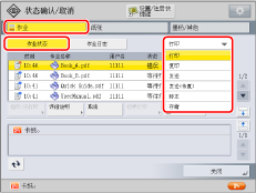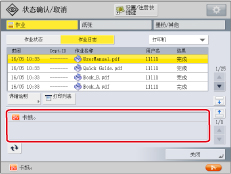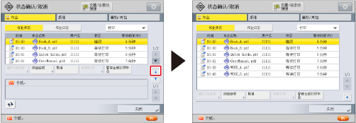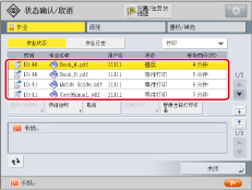 屏幕左侧的图标表示作业状态。有关图标类型和详细说明的信息,请参阅“作业屏幕上的图标”。 如果在作业类型中选择[打印],则会显示处理每项作业的大约等待时间。 如果有等待输入密码的加密文档,则处理该作业的大约等待时间会显示为“---分钟”。 |