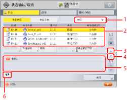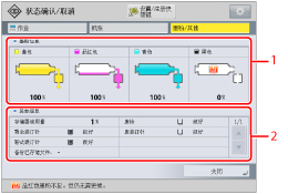 (状态确认/取消)时,会出现“状态确认/取消”屏幕。可以在此屏幕上更改作业顺序、取消作业,以及确认作业状态和作业日志的详细信息。也可以获取耗材的详细信息。