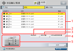 2 | 作业列表 在“作业状态”屏幕上,可以查看当前的作业和等待的作业。按作业列表下方的按钮,可以更改等待的作业的顺序、取消作业和检查作业详细说明。 根据正在操作的作业类型,显示的按钮可能有所不同。有关在“作业状态”屏幕上显示的按钮的详细信息,请参阅“作业屏幕上的图标”。 |