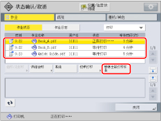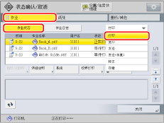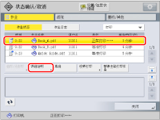 如果选择打印作业并按[详细说明],按[纸张输送]可以强行打印存储器中剩余的打印数据,按[略过错误]可以暂时禁用错误并继续打印。[纸张输送]和[略过错误]只能用于从计算机发送的打印作业。 如果作业发布时指定的纸张不可用,则会出现一条信息要求添加合适的纸张。装入纸张,然后重新开始作业。如果“设置/注册”下[功能设置]中的[已中止的作业超时]设置为“打开”,则由于没有可用于打印的纸张而中止的作业在超过指定的时间后会显示为已中止的作业。要重新开始打印已中止的作业,添加纸张→选择作业→按[详细说明]→[重新开始]。 |