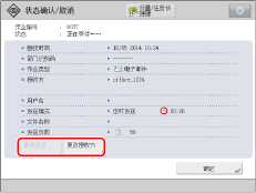 [更改接收方]: | 更改接收方。如果选择的作业具有多个接收方,按[多路发送列表]→选择想要更改的接收方→按[更改接收方]。 |