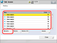 根据网页的不同,名称可能留为空白。 如果显示图像文件,名称会留为空白。 选择[Name](名称)或[Order](顺序)可以按升序或降序对URL历史记录列表进行排序。 |