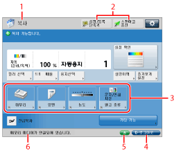6. | 작업과 복사 조작의 진행 및 기기와 소모품 상태가 여기에 표시됩니다. 또한 사용 중인 로그인 서비스에 따라서 부문별 ID 또는 사용자 이름이 표시될 수도 있습니다. |