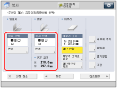 앞쪽 백지, 뒤쪽 백지 또는 삽지에 서로 다른 용지 크기를 설정한 경우, 다른 기능에 대한 용지 크기가 자동으로 새 용지 크기로 변경됩니다. 그러나 특정 기능에 대한 용지 공급원을 동일한 크기의 용지가 들어 있는 용지 공급원으로 변경해도 다른 기능에 대한 설정이 변경되지 않습니다. Document Insertion Unit-N에서 용지를 급지하기 전에 용지를 Document Insertion Unit-N에 넣고 용지 크기를 지정합니다. Document Insertion Unit-N에서 용지를 급지하려면 [인서터 1] 또는 [인서터 2]를 선택합니다. 현재 작업을 위해 Document Insertion Unit-N에서 용지가 급지되는 경우, [인서터 1 변경] 또는 [인서터 2 변경]을 눌러 삽지 용지를 선택합니다. |