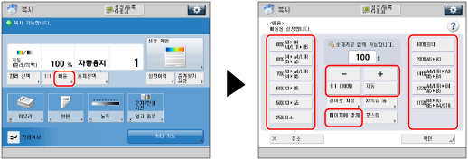 [자동]을 설정한 경우, 용지 크기를 수동으로 선택해야 합니다. 용지 크기를 선택하지 않은 경우, 용지 카세트 1에 보급한 용지 크기에 맞게 배율이 자동으로 설정됩니다. |