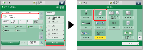 수신인을 지정하고 → [기타 기능]을 누르고 → [양면원고]를 누릅니다.