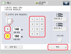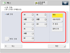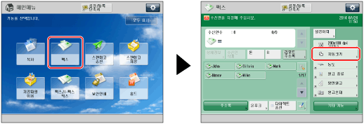 → [팩스]를 누르고 → 스캔 크기 버튼을 누릅니다.