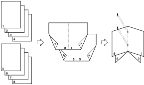 출력 용지가 1매인 경우에는 중철이 수행되지 않습니다. 접기의 정확도는 용지의 종류 및 양에 따라 다를 수 있습니다. |
