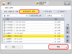 등록된 날짜([등록순]), 이름([명칭순]) 또는 기본 무게([평량순])에 의해 용지 종류 리스트를 정렬할 수 있습니다. |