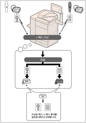 수신한 I-팩스 문서에 첨부된 이미지 파일이 이 기기와 호환되지 않을 경우 해당 파일은 기기에서 처리(인쇄, 전달 또는 저장)되지 않습니다. 대신에 파일이 삭제됩니다. 이 경우 수신한 I-팩스의 텍스트와 함께 삭제된 파일의 이름 및 <첨부파일을 처리할수 있는 프로그램이 없습니다.>라는 메시지가 인쇄됩니다. 팩스/I-팩스 박스에서 원치 않는 파일 및 이미지 데이터를 삭제하여 새 파일을 저장할 공간을 확보하는 것이 좋습니다. [나에게 송신]은 SSO-H에 의한 인증 사용 시 사용자의 이메일을 등록하는 경우에만 표시됩니다. [내 폴더]는 SSO-H와 같은 로그인 서비스로 인증을 설정한 경우에만 표시됩니다. |