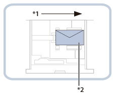 *1 급지 방향 *2 인쇄 면 아래 인쇄 시 적재된 용지의 방향이 프린터 드라이버의 인쇄 설정 화면에 표시된 방향과 일치하는지 확인하십시오. 자세한 내용은 온라인 도움말을 참고하십시오. ("프린터 드라이버 도움말" 참고) 봉투를 복사하려면 원고를 놓기 전에 원고를 회전시키십시오. ISO-C5를 90도 회전시키는 경우, 출력을 하기 전에 사용자설정 크기를 229 x 162 mm로 설정하십시오. |
