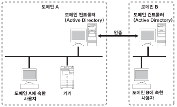 도메인 A(이 기기를 포함하고 있는)에 속한 사용자, 도메인 B(도메인 A에 의해 양방향으로 트러스트되는)에 속한 사용자 및 기기 자체에 등록된 사용자를 인증할 수 있습니다. 사용자는 로그인할 때 로그인 경로(도메인명 또는 [디바이스])를 선택합니다.
