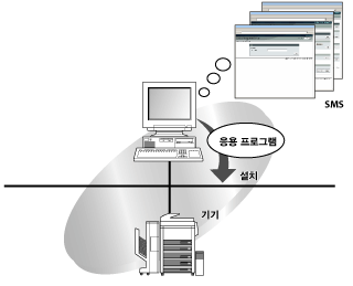 SMS(Service Management Service)는 사용자가 웹 브라우저를 사용하여 네트워크를 통해 Color imageRUNNER/imageRUNNER, imagePRESS 또는 imageRUNNER ADVANCE 기기 (이하 '기기')에 접근하여 MEAP 응용 프로그램을 설치하고 관리할 수 있도록 하는 소프트웨어입니다. 기기에는 SMS를 사용하기 위해 필요한 소프트웨어(웹 서버 소프트웨어)가 포함되어 있습니다. SMS를 사용하기 위해 필요한 것은 웹 브라우저와 컴퓨터와 기기 사이의 네트워크 연결 뿐입니다. 기기가 사용자의 컴퓨터가 사용하는 것과 같은 네트워크에 연결되어 있으면 SMS를 사용할 수 있습니다. SMS를 사용하여 다음 작업을 수행할 수 있습니다.