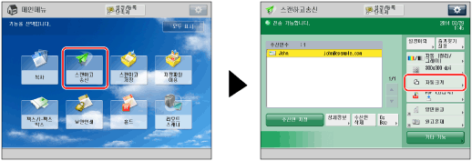 → [스캔하고 송신]을 누르고 → 수신인을 지정한 후 → 스캔 크기 버튼을 누릅니다.