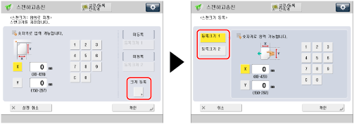 [X] 및 [Y]를 누르고 → 숫자 키를 사용하여 스캔 크기를 mm로 입력하고 → [확인]을 누릅니다.