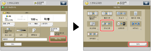 원고를 피더에 세트한 경우에는 각 원고 묶음의 스캔이 완료되었을 때 원고 배지 영역의 원고를 제거하십시오. 연속 스캔 모드 중에 [설정변경]에 나타나는 설정만 변경할 수 있습니다. 먼저 필요한 스캔 설정을 지정해야 합니다. |