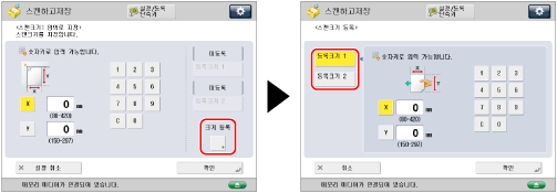 [크기 등록]을 누른 후 [등록크기 1] 또는 [등록크기 2]를 선택합니다.