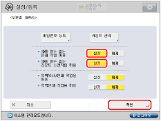 <ID를 알수 없는 인쇄 작업 허용> 및 <ID를 알수 없는 리모트 스캔작업 허용> 설정은 기기에 인쇄 기능 및 리모트 스캔 기능이 장착된 경우에만 사용가능합니다. |