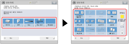 복사 화면에 표시된 단축키에 모드를 등록할 수 있습니다. [기타 기능] 및 [즐겨찾기 설정]에서 원하는 버튼을 다섯 개까지 등록할 수 있습니다.