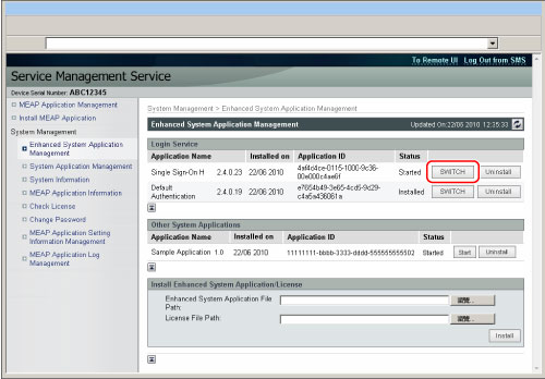 Default Authentication(部門識別碼管理)被預設為可用狀態。若要使用SSO-H,請在變更登入服務前將[部門識別碼管理]設定為「關閉」。有關「部門識別碼管理」設定的詳細資訊,請參閱「指定部門識別碼管理」。 |