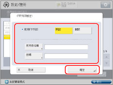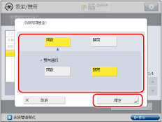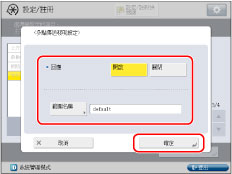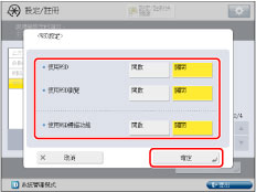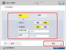 若要使用IPP認證功能,<使用認證>按[開啟]。按[使用者名稱]→輸入要用於IPP認證的使用者名稱→按[確定]。按[密碼]→輸入要用於IPP認證的密碼→按[確定]。在「確認」螢幕中,輸入相同的密碼以確認密碼→按[確定]。