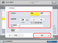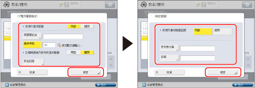 若要使用代理伺服器認證,按[設定認證]→<使用代理伺服器認證>按[開啟]。按[使用者名稱]→輸入要用於代理伺服器認證的使用者名稱→按[確定]。按[密碼]→輸入要用於代理伺服器認證的密碼→按[確定]。在「確認」螢幕中,輸入相同的密碼以確認密碼→按[確定]。