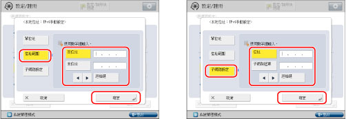 若要設定子網路:按[子網路設定]→按[位址]→輸入IPv4位址→按[子網路遮罩]→輸入子網路遮罩。