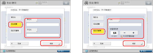 若要指定IPv6位址範圍:按[位址範圍]。按[首位址]→輸入IPv6位址首位址→按[確定]。按[末位址]→輸入IPv6位址末位址→按[確定]。