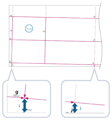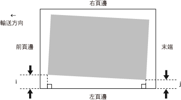 「i」標記會列印在左前頁邊,「j」標記則會列印在送紙方向的左側末端。