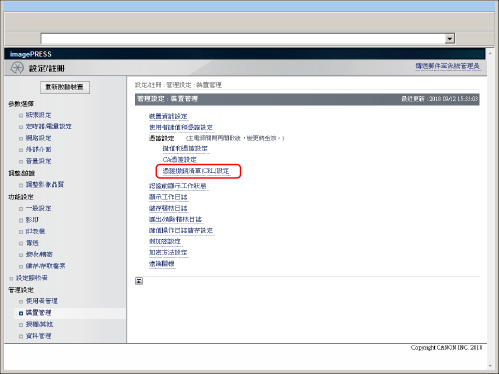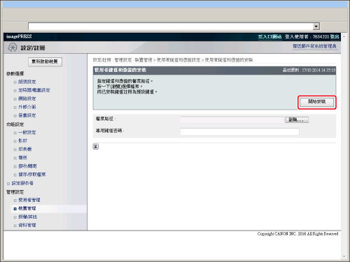 使用「遠端使用者介面」安裝鍵值對檔案和伺服器憑證檔案。透過從本機器的控制面板對已安裝的鍵值對檔案和伺服器憑證檔案進行註冊,可以將其作為鍵值對和伺服器憑證使用。