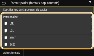 Une fois les paramètres papier par défaut enregistrés, l'écran de définition du papier ne s'affiche plus lorsque vous insérez du papier, et les mêmes paramètres sont appliqués systématiquement. Si vous chargez un papier de format ou de type différents sans modifier les paramètres papier, l'appareil risque de ne pas imprimer correctement. Pour éviter ce problème, sélectionnez <Spécifier lors du chargement du papier> à l'étape 3, puis chargez le papier. |