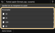 Une fois les paramètres papier par défaut enregistrés, l'écran de définition du papier ne s'affiche plus lorsque vous insérez du papier, et les mêmes paramètres sont appliqués systématiquement. Si vous chargez un papier de format ou de type différents sans modifier les paramètres papier, l'appareil risque de ne pas imprimer correctement. Pour éviter ce problème, sélectionnez <Spécifier lors du chargement du papier> à l'étape 3, puis chargez le papier. |